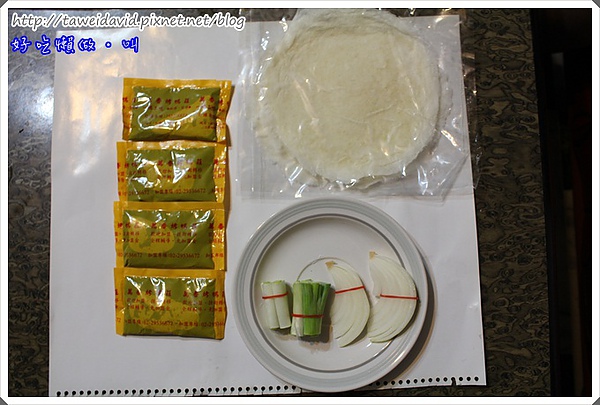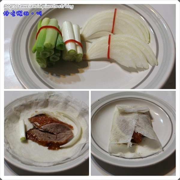 一隻鴨所附的配料有兩包餅皮,四包甜麵醬及洋蔥和三星蔥段