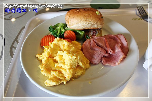前面的櫃子是超值早餐,有炒蛋、火腿和花椰菜,裝好的菜色會整盤放在櫃子上。