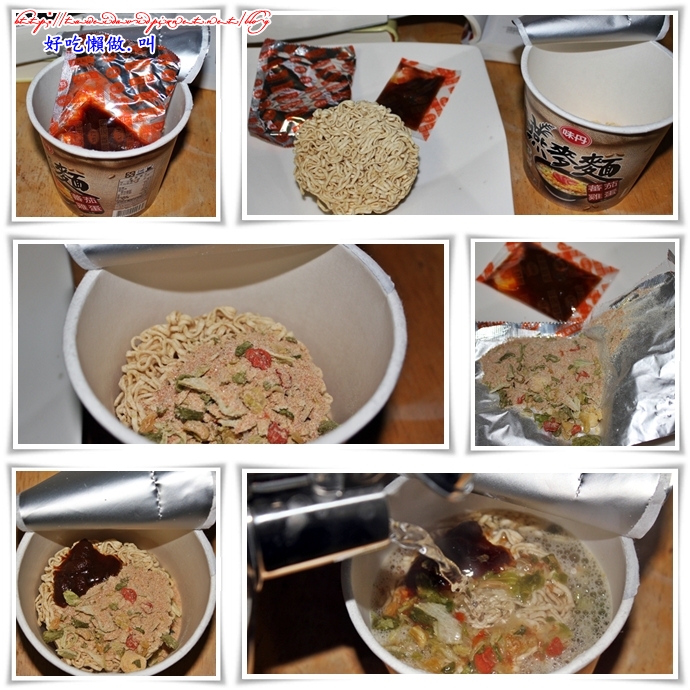 倒入杯麵中,加入滾燙的熱水,耐心的靜待三分鐘之後,就可以開動了!