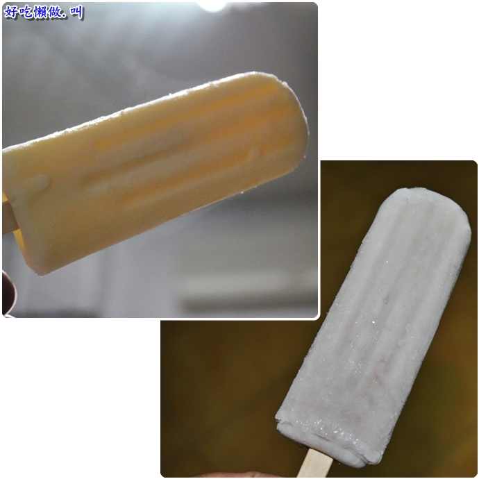 綠豆口味冰棒,從頭到尾都吃的到滿滿綠豆,用料相當實在,冰棒清甜不膩口。右側芋頭冰棒,