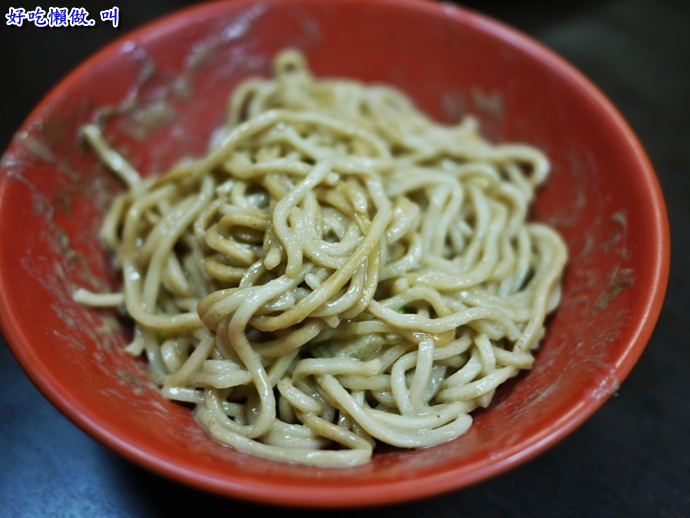 這裡的麻醬麵多了幾葉的青菜之外,就剩下芝麻醬跟麵條的搭配,吃法也是相當簡單。店裡的芝