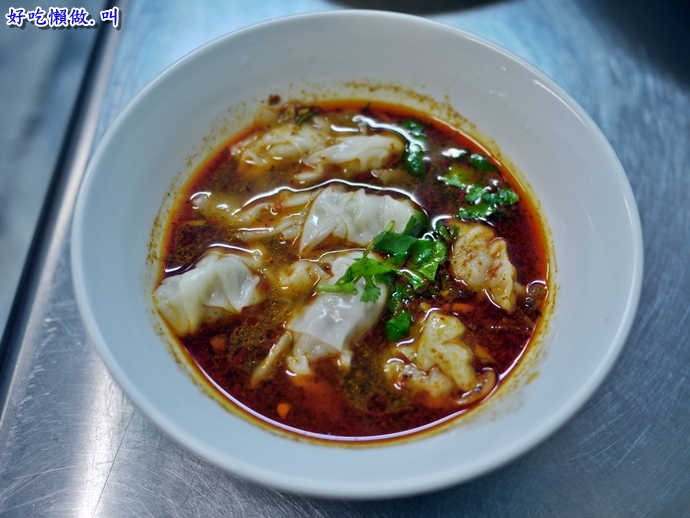 八顆餛飩浸在紅咚咚的辣油裡,還沒吃就覺得會噴火。一口咬下餛飩,皮薄肉餡入味,但隨之而