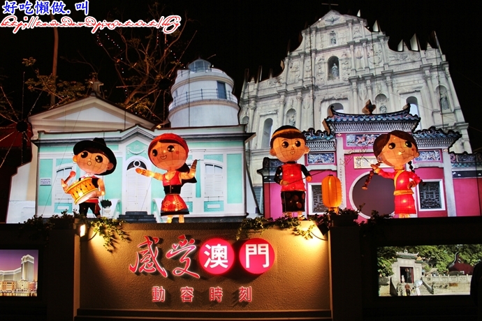 大三巴、東望洋燈塔前,身著中式傳統與葡萄牙服飾的可愛造型人偶花燈,向造訪民眾拜年,呈