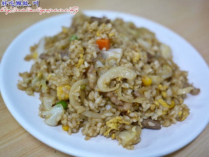 肉絲蛋炒飯,加入洋蔥、高麗菜、肉絲跟散蛋,飯的米心比較硬,雖然口感相當不錯,鹹淡